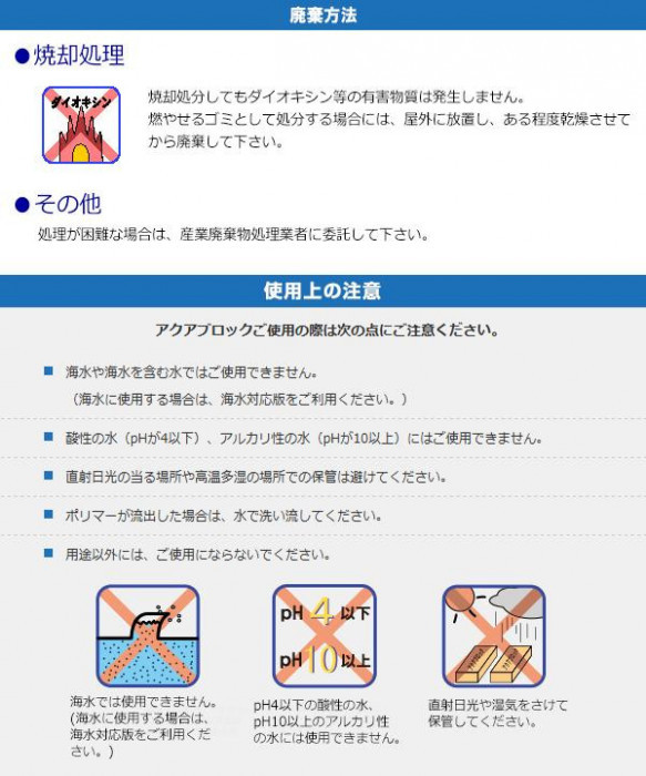 真水対応の再利用可能な吸水性土のうです。紫外線に強く、劣化の少ない高品質の高吸水性ポリマーを使用することで、再利用を可能としました。屋外で陰干しすると、再利用することができます。保管に場所もとりません。 |