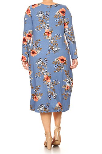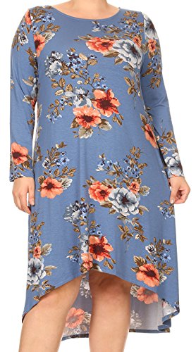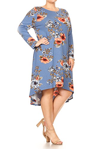 BNY Corner Women Plus Size Long Sleeve Floral High Low Midi Length Casual Dress Blue XL (D524 FLO)