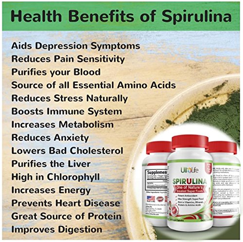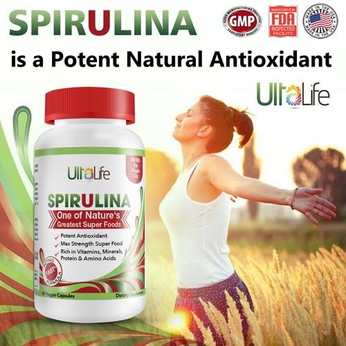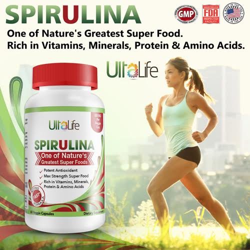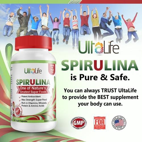 -. Feature : * SPIRULINA IS A POTENT NATURAL ANTIOXIDANT, EXTREMELY HIGH IN MANY NUTRIENTS- More iron than spinach and more beta carotene than carrots. UltaLife SPIRULINA supports eye health, immune function, healthy cholesterol levels, cellular health, metabolism boost and increased energy. SPIRULINA is low in calories and a complete source of protein-- which makes it an awesome help with weight loss. / *These 500 mg super food formula capsules are rich in Vitamins, Minerals, Protein & Amino Acids with NO NASTY AFTER TASTE! Packed with fiber, protein, vitamins (ex: vitamins A, B1, B2, B6 and K), essential minerals like iron, calcium and magnesium, trace minerals, essential fatty acids, nucleic acids, polysaccharides and antioxidants. An amazing vegetarian whole SUPERFOOD to increase energy, aid in weight loss and detox your body. / * What are the BIG DIFFERENCES between CHLORELLA and SPIRULINA? Spirulina is a blue-green algae that is thousands of years older than chlorella. Spirulina contains more protein than chlorella-- on average Spirulina contains 12 times more protein than beef! Spirulina is a better source of GLA (gamma-linoleic acid), a 'good' fat that is essential for healthy brain & heart function. Spirulina contains higher concentrations of phycocyanin that gives Spirulina its special blue tint. / * YOU CAN TRUST ULTALIFE: 100% safe and natural Veggie Capsules. No artificial ingredients, no fillers or binders. We use only the very best quality ingredients. UltaLife's SPIRULINA supplement is manufactured in USA in an FDA-inspected, State-of-the-Art facility with strict adherence to good manufacturing practices. UltaLife manufactures only high quality, premium high potency vitamins, capsules, pills, tablets, powders, multivitamins and supplements for men and women. / * GUARANTEED RESULTS OR YOUR MONEY BACK! Spirulina--prounounced SPEAR-YOU-LENA-- is found in ponds & bodies of water and is one of the most potent nutrient sources on earth! Put UltaLife SPIRULINA to the test and experience the results for yourself with absolutely no risk. We believe it will be a welcome nutrient addition to your life. CLICK ADD TO CART NOW.