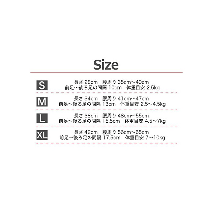 【S】길이 28cm 흉주위 35cm~40cm,앞발~뒷다리의 간격 10cm 체중 기준 2.5kg 【M】길이 34cm 흉주위 41cm~47cm,앞발~뒷다리의 간격 13cm 체중 기준 2.5kg~4.5kg 【L】길이 38cm 흉주위 48cm~55cm,앞발~뒷다리의 간격 15.5cm 체중 기준 4.5kg~7kg【XL】길이 42cm 흉주위 56cm~65cm 앞발~뒷다리의 간격 17.5cm 체중 기준 7kg~10kg