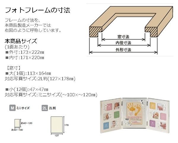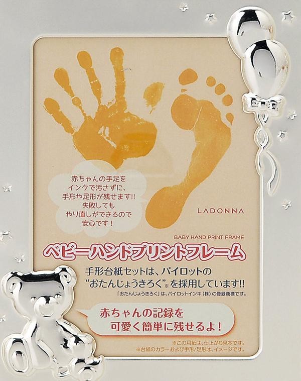 | 誕生から1歳までの写真を飾ることができる「成長記録フレーム」。中央の手がた色紙には、お子様の手足を汚さずに簡単に手がた・足がたをとることができる、パイロットインキ株式会社の「おたんじょうきろく」手がた色紙を採用!! |