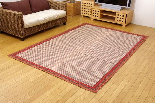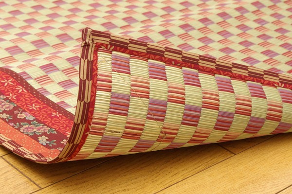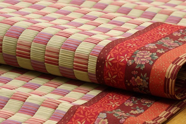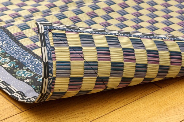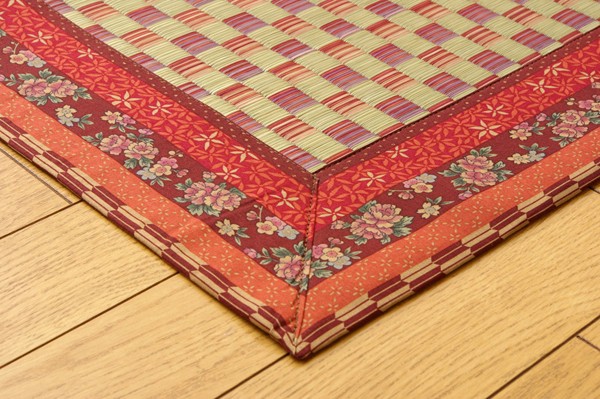 高級感のある花柄のヘリを使用した大目織りの花ござカーペットです。国産(九州産)のい草を使用しています。一本一本が太く、表皮が厚く繊維がキメ細かいので弾力性があり、耐久性に優れています。い草には空気の自然浄化作用、湿度の調節作用などがあります。また汚れにくく、使用するうちに黄金色に変化し味が出ます。い草に青森ヒバ加工を施しています。(抗菌、防臭効果)