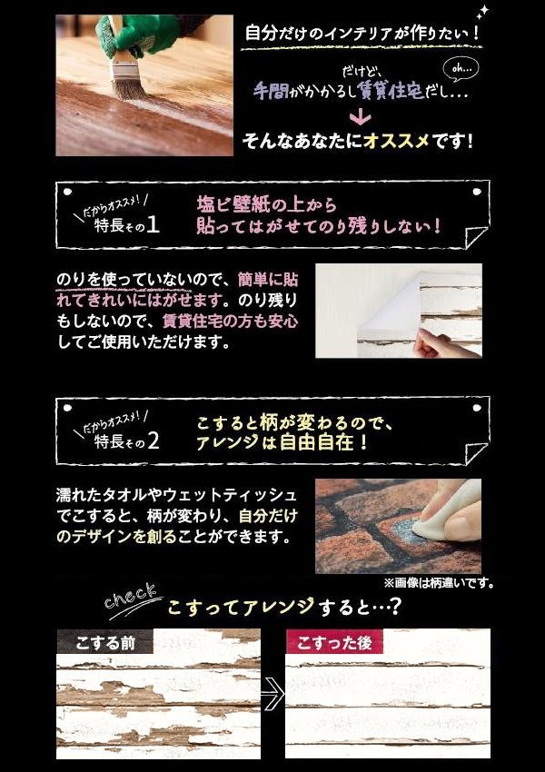 近年、DIYの流行により「自分だけのものづくり」が注目されています。塗料も、あえて古い質感を出せるものが多くお部屋に合わせて自分でアレンジすることが人気となっています。壁紙も、色々なアレンジを楽しみたい!!そんな方にピッタリの壁紙です。この壁紙は、水でこするだけで表情の変化が楽しめますので、オリジナルのアレンジを楽しめます。 |