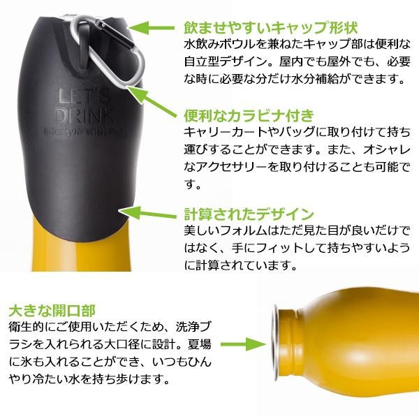 | 持ち手にフィットする美しいデザインのステンレス製ボトルです。キャップ部がそのまま自立型の水飲みボウルになるので、ボトルと水飲みボウルを両方持っておでかけする必要がなく、屋内でも屋外でも必要なときに水分補給ができます。 |