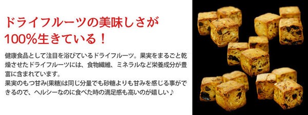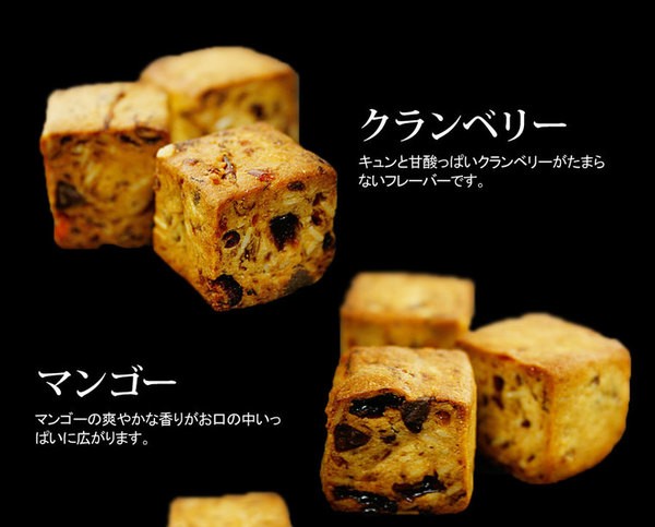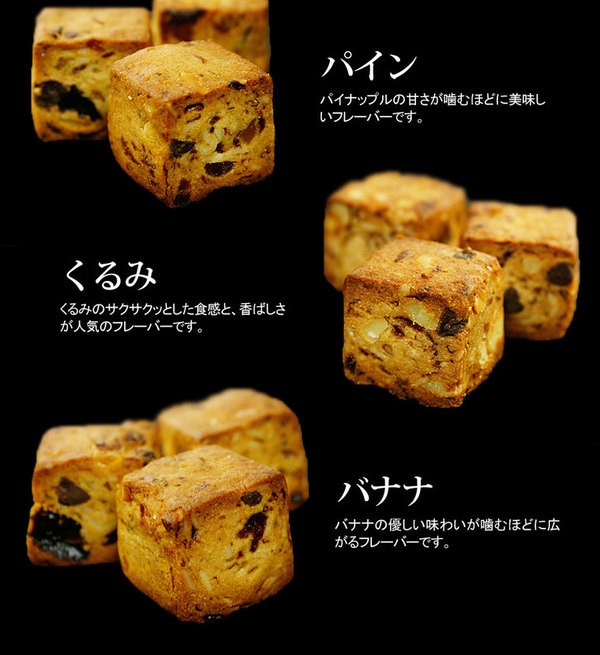 大豆粉、レーズン、砂糖、マーガリン、大豆粉、スライスアーモンド、卵、純チョコレートチップ、くるみ、ドライマンゴー(マンゴー、砂糖)、ドライバナナ(バナナ、砂糖)、ドライパイナップル(パイナップル、砂糖)、ドライクランベリー(クランベリー、砂糖、植物油)、食塩、乳化剤、酸味料、酸化防止剤(亜流塩酸、V.E)、香料、着色料(カロテン)、原材料の一部に乳を含む