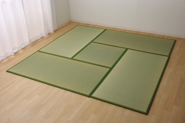 届いたユニット畳を床に置くだけで和のスペースが出来上がります。表生地には国産(九州産)のい草を使用しています。一本一本が太く、表皮が厚く繊維がキメ細かいので弾力性があり、耐久性に優れています。い草には空気の自然浄化作用、湿度の調節作用などがあります。また汚れにくく、使用するうちに黄金色に変化し、味が出ます。中材には10mmの硬わたを使用しておりますので適度なクッション性があります。裏地には滑りにくいウレタンフォームを使用しています。青森県尾ヒバの木から抽出した「ヒバエッセンス」をメーカー独自の技術で生地表面に加工しました。ヒバエッセンスにはヒノキチオールという、天然物物質としては極めて抗菌性の高い成分が含まれています(無加工品に比べ抗菌、防臭効果)。また軽量タイプなので、持ち運び、設置、片づけなども楽にできます。