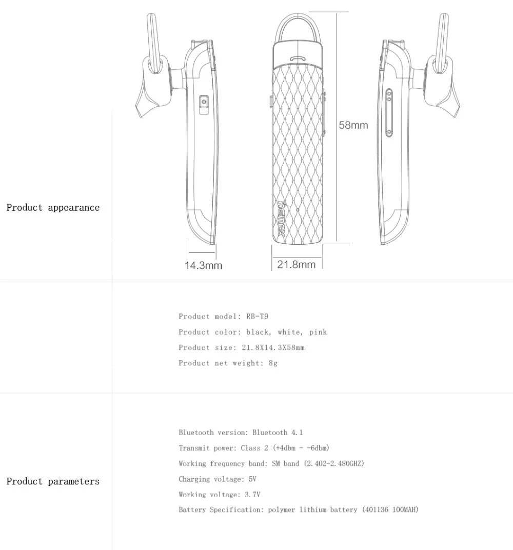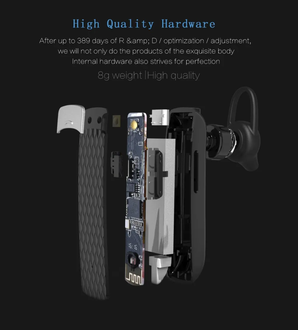 Unique Clip-on design and mini style, perfect for your sports and outdoor activities. With built in mic. Advanced technology, Bluetooth V4.1 / HD clear stereo music. Eco-friendly material. Intelligent mic noise reduction technique, and 300 hours long standby time.