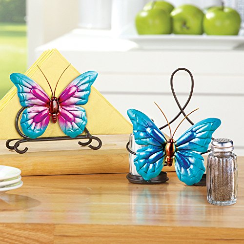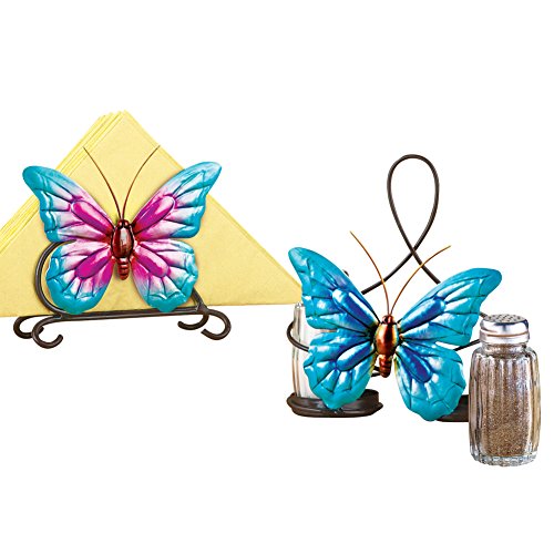Studio : Collections Etc Publisher : Collections Etc Product Description Blue Butterfly Kitchen Decor Accessories Salt And Pepper Shaker Set Description The napkin holder features a large blue and pink butterfly, while the salt and pepper caddy has a blue butterfly and a twining vine that forms a handle. The shakers have twist off tops for easy filling and are hand-washable. Iron and glass. Napkin holder: 5"L x 2"W x 4 1/2"H, Salt Pepper holder: 5 1/4"L x 2 1/2"W x 5 3/4"H, shakers: 1 1/2"Dia x 3"H. No Risk Purchase, Hassle-Free Returns - 100% Satisfaction Guaranteed With customer satisfaction as our number one priority, we proudly offer a Satisfaction Guarantee for all of our merchandise and services. From our appealing merchandise and incredible values, to our friendly customer service, we strive to provide a positive shopping experience by meeting or exceeding your expectations.If you are not completely satisfied within 60 days of your purchase (see return policy for details).