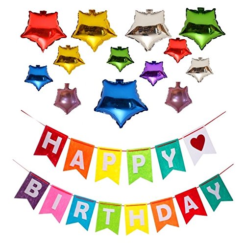 -. Title : Happy Birthday Kids Party Rainbow Supplies Felt Cloth Decorations Banner with 12 Star-Shape Random Color Foil Membrane Balloons