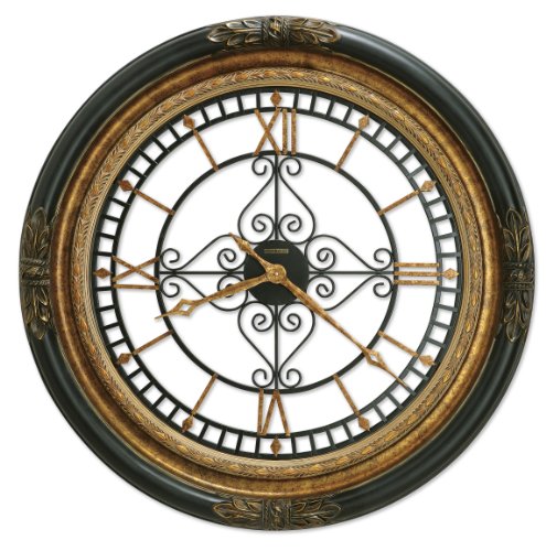 -. Feature : The wrought-iron dial with center scroll décor offers applied Roman numerals, markers, and open fret-cut, diamond shaped hands finished in aged gold / Quartz, batter-operated movement