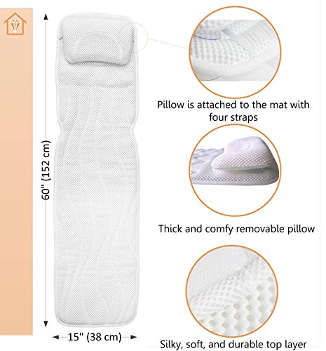Extra Long( 60 x 15 inches) Full Body Bath Mat with Removable Pillow- Supports Head, Neck, Shoulders, Back , Tailbone and Legs- Non -Slip with 14 large Suction Cups- Anti Bacterial and Quick Drying