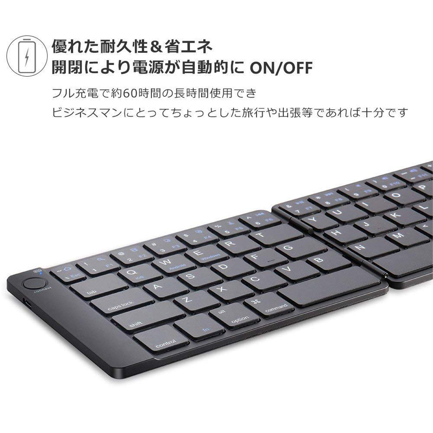 ✅【優れた耐久性&省エネipad iphone bluetoothキーボード】:軽量薄型で持ち運びしやすい、60時間のバッテリー持ち。 操作楽々なマグネット式で、開閉により電源が自動的にON/OFFになり、特別な電源操作は不要でなかなか快適です。USB標準オスフル充電で約60時間の長時間使用となっており、ビジネスマンにとってちょっとした旅行や出張等であれば十分です。
