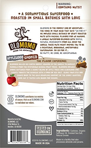 - SMOKY FLAVORED NUTS - OLOMOMO - Applewood Smoked Cashews are infused with smoke from a blend of apple trees and alderwood, with a hint of sweetness and saltiness. Close your eyes and escape to the calm crackling comfort of a smoky campfire.