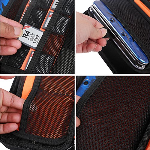 -. Feature : Raw Material: sturdy nylon, shockproof sponge, ripstop breathable cloth. / Reasonable structure: The wings thicken hold 3DS GAMES, which is tight and safe. A small broad can hold 8 game cards, the rubber loops can hold USB cable, and one 3ds adapter card bit. / Lightweight 3DS case is portable. Carrying games with electronic accessories, go where to play for a perfect daytrip. / There is a pocket on the outer side that holds the ID card and other carry-on items. / Adjustable shoulder straps and brand zippers will definitely not disappoint you.