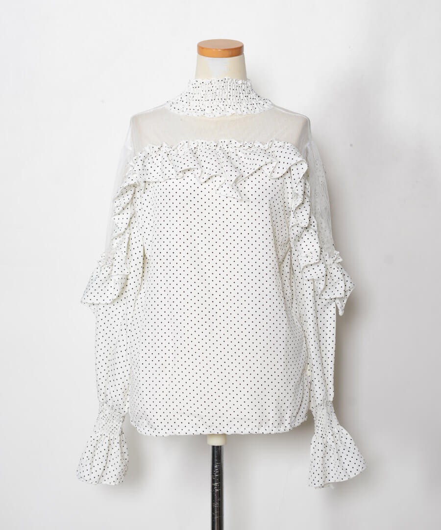 ドット柄ブラウスは、シースルーとフリルの