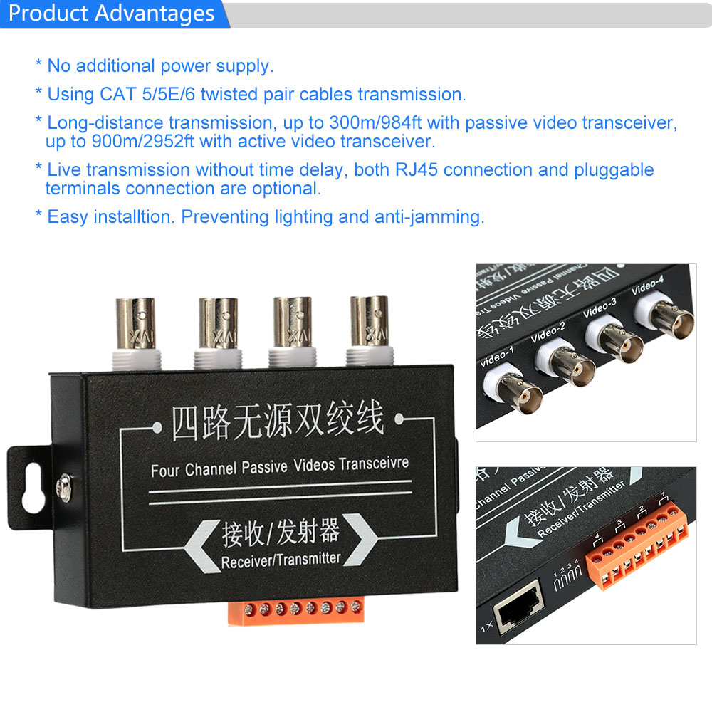 This 4 channel passive video transceiver without additional power supply uses 4 pairs twisted-pair cables to transmit 4 channel video picture signal. This equipment are compatible with PAL, NTSC and SECAM baseband Composite Video signals. It can be used as transmitter, can also be used as receiver(So this equipment can be used in pairs). Finally, you can use it with various other passive or active UTP Video Balun Transceivers. Small in size, easy for installation, it's nice to have.