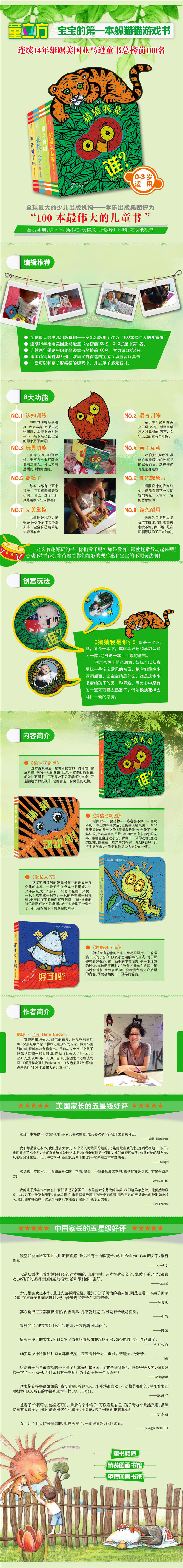 尼娜·兰登(Nina Laden):在美国纽约长大。母亲是画家,热爱毕加索的画,父亲是雕塑家及特殊化妆效果的专家,热爱马蒂斯的画。尼娜喜欢创作童书,是美国大师级纸板玩具书创作者,目前与先生及三个孩子住在华盛顿州的西雅图。作品《我长大了》(Grow up)入选2004年 CCBC 合作儿童图书中心精选书目,《猜猜我是谁》(Peek-a who)入选美国学乐杂志评选的“100本最伟大的儿童书”。