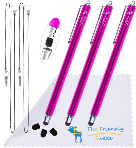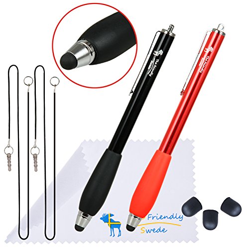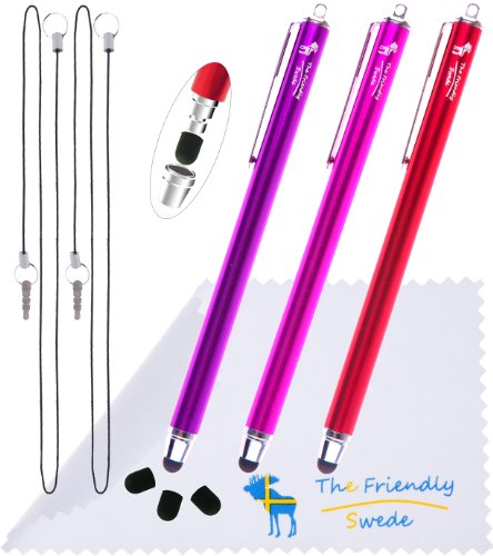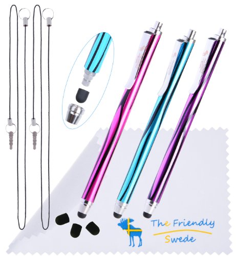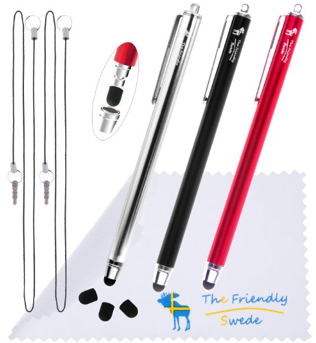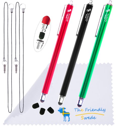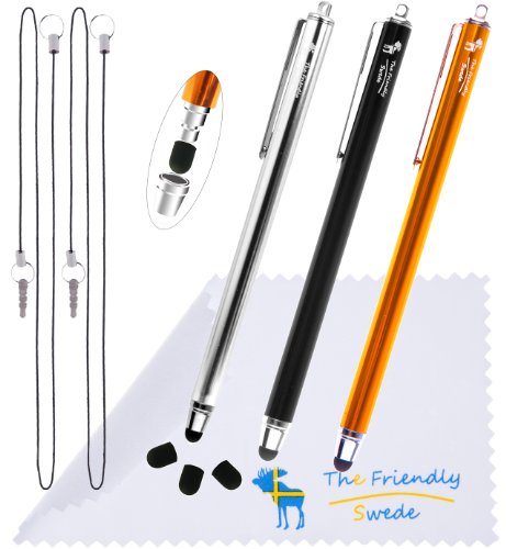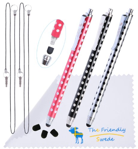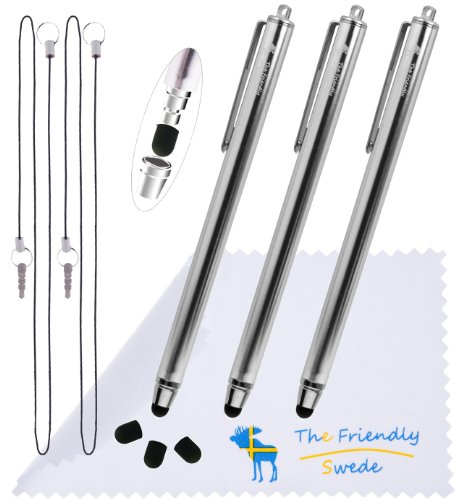 - Feature : Bundle of 3PCS Premium Branded 5.5" Thin-Tip High Precision Universal Capacitive Stylus Pens in stainless steel and Aluminum / 100% compatible with touch pad devices such as iPod, iPad, iPhone & more / Extra 3 replaceable tips included, replacing can be done within a second without tool / Please note! The package includes TWO 15" Detachable elastic tether strings keep your pens handy for use / The Friendly Swede® Microfiber Cleaning Cloth and Retail Packaging - Premium quality accessories - hand picked or produced by The Friendly Swede®
