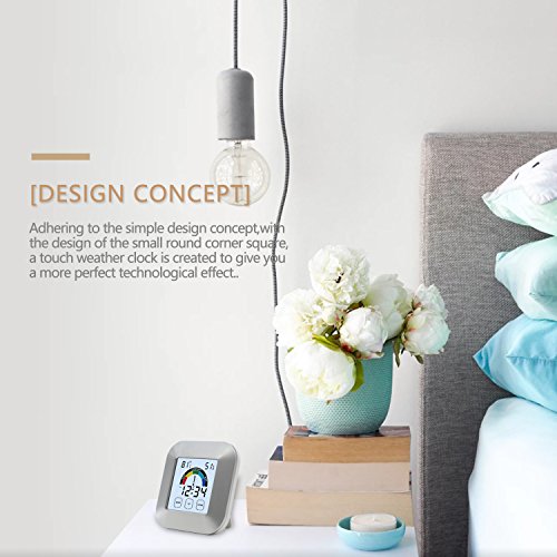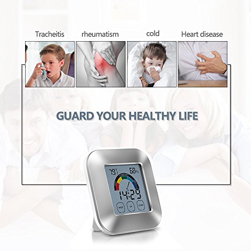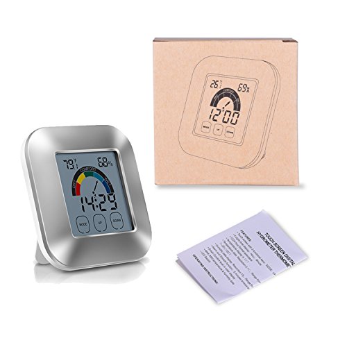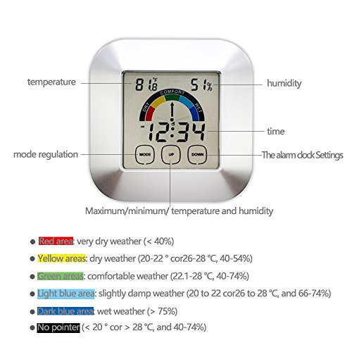 Fahrenheit or Celsius available (MODE button); MAX or MIN temperature and humidity records available (UP button); Range of temperature detecting : 32℉to 122℉; Range of humidity detecting: 20% to 95% with resolution 1%. Reference Value DRY: Humidity < 40% COMFORT: 40% < Humidity < 74%, 71.8℉< Temperature < 82.4℉ WET: Humidity > 75% The reference value of most comfortable condition is 40% < Humidity < 74%, 71.8?< Temperature < 82.4?. Time Alarm Setting Set the right time in hour, minute (in 12-hour or in 24-hour). Set the alarm as the time set (an alarm icon shows on the screen). In alarm condition, press MODE to snooze mode or press any one button to stop. The blue backlight is bright to make the screen easy to read in the dimness when activated, and it turns off after 5 seconds automatically to save power without activity. Specification Size: 3.3* 3.3* 1 inches Weight: 4oz Package Included: 1* Thermometer Hygrometer 1* Manual 0