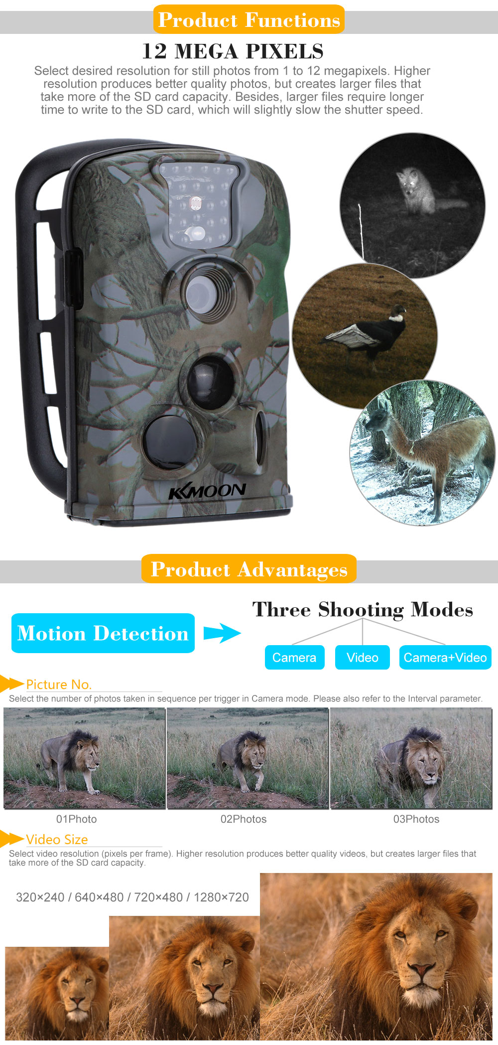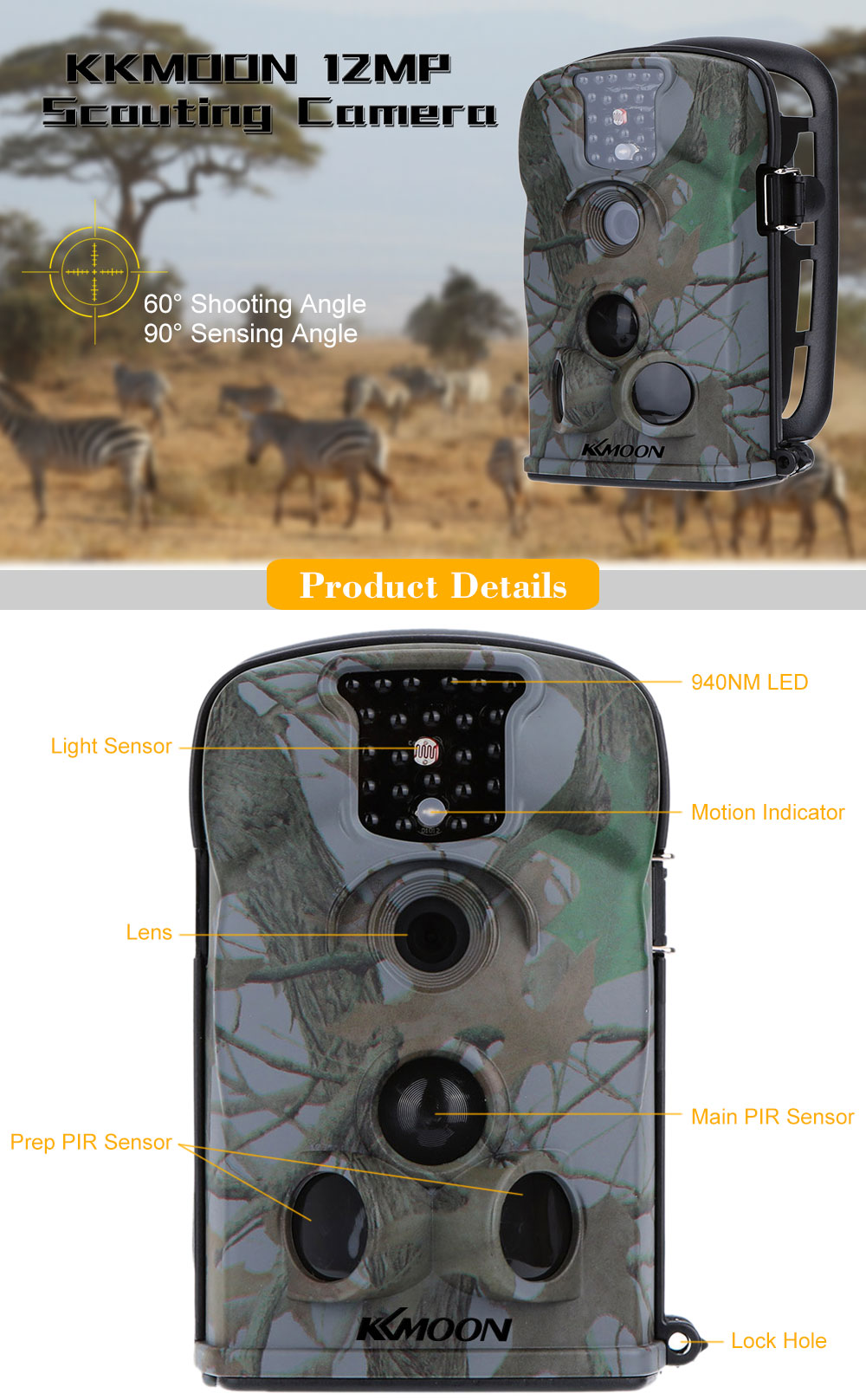 This camera provides wide angle lens up to 60 degree. It is designed to capture clear 12MP images and high definition 1080p video at 30fps and can be triggered by sudden change of ambient temperature caused by moving game in a region of interest (ROI)£¬ which is detected by a highly sensitive Passive Infra-Red (PIR) sensor£¬ and then take pictures or video clips automatically. The camera can operate in three different modes£¬ including Motion Detect£¬ Time Lapse(1£¬Camera: 01 photo£¬02 photos£¬ 03 photos. 2£¬video. 3£¬ Camera + video.)£¬Voice recording. Our scouting camera has an impressive 1 second trigger time. The combination of the two side prep sensors and the main sensor comes up with a 100¡øto 200¡øangle of induction£¬ a very wide scope far outweighing the 90¡øangle of the camera lens. When game first crosses the PIR area of the prep sensor£¬ the camera is activated and ready to shoot after 1 second. This camera's split-second process could be as short as 0.2 second.