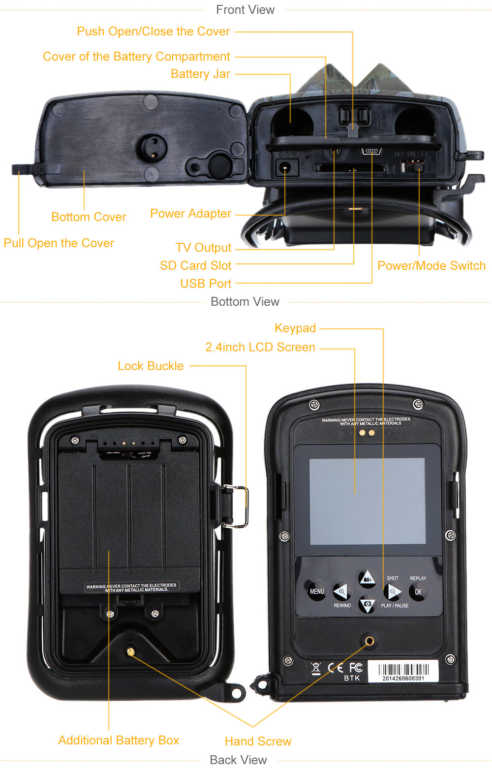 The Trail camera provides the following connections for external devices: USB port£¬ SD card slot£¬ TV out jack and external DC power in jack. The 3-way Power/Mode Switch is used to select the main operation modes: OFF£¬ ON and TEST. The scouting camera trail camera comes with preset manufacturer settings. You can change the settings to meet your requirements.