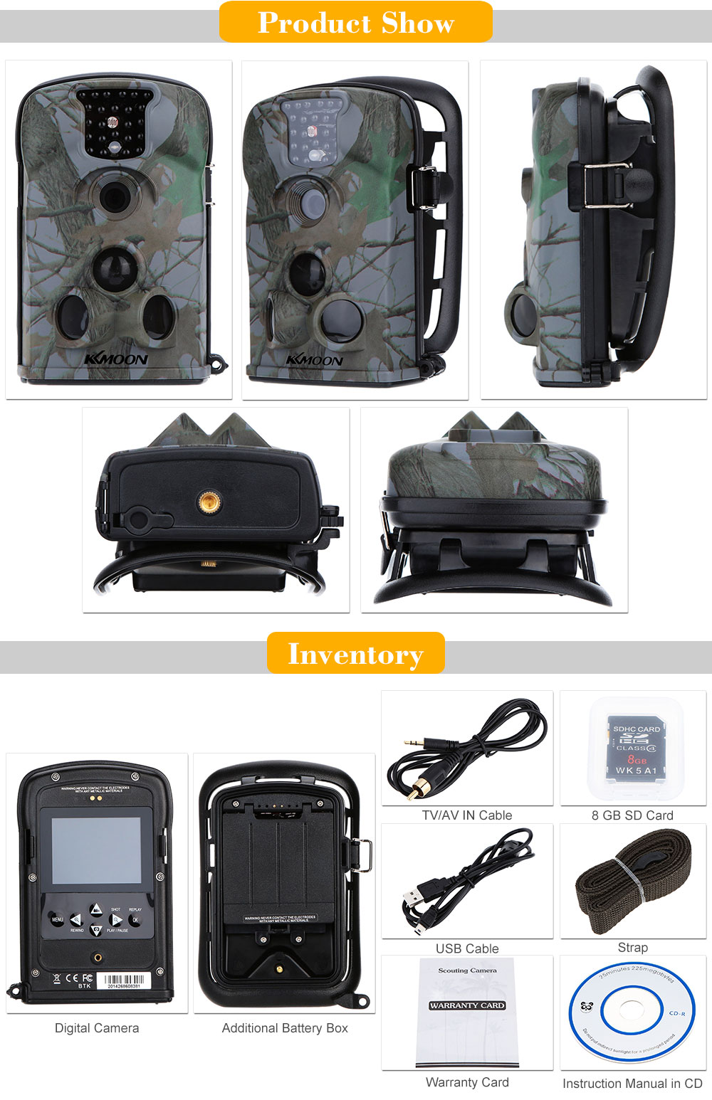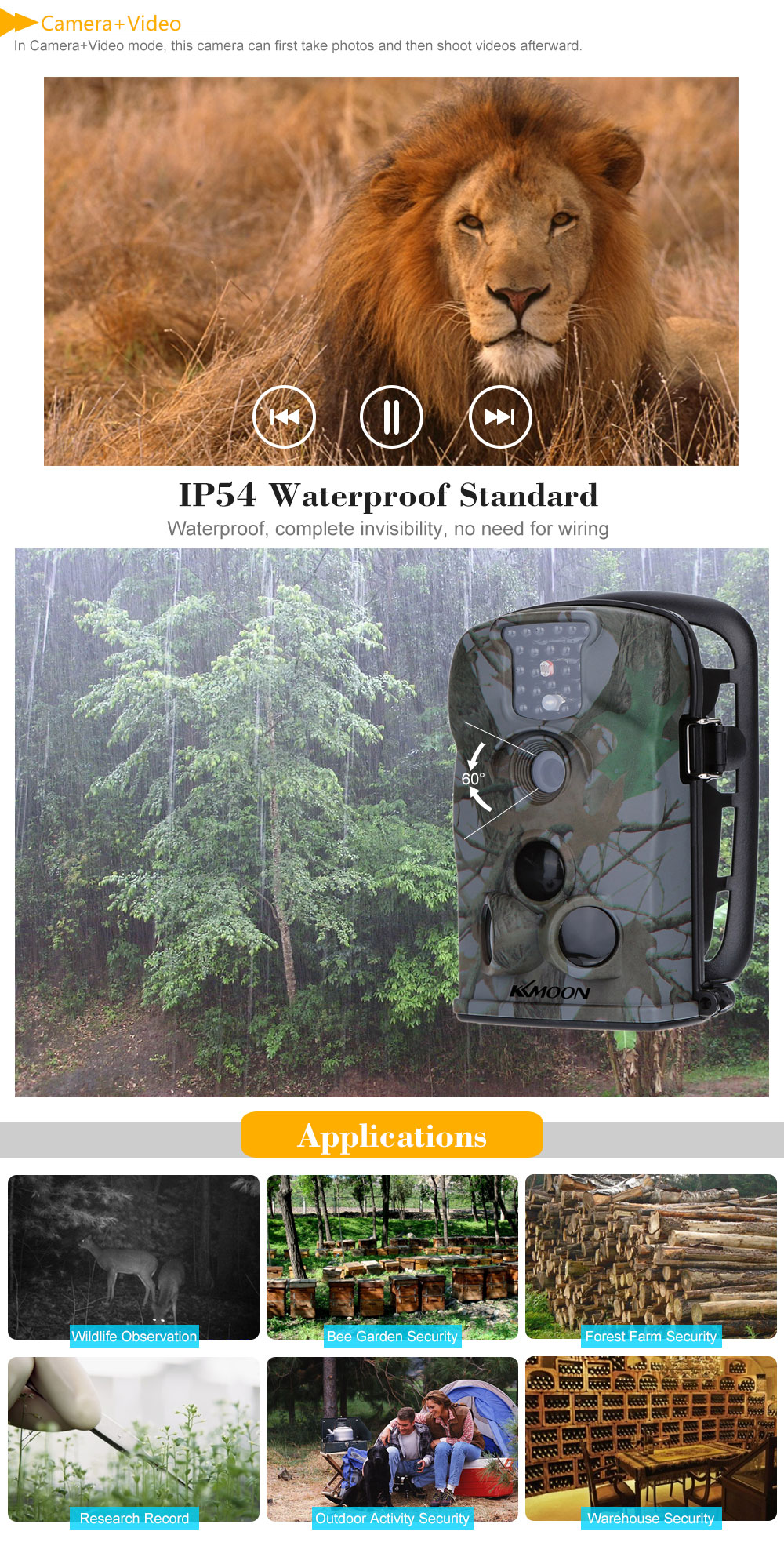 Our scouting camera has many uses: the detection of wildlife£¬ monitoring for unattended home and warehouse protection£¬ the plant growth record and observation in scientific research£¬ Safety Monitoring for bee gardens and forest farms£¬ and other surveillance needs for outdoor/indoor.