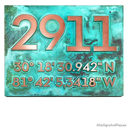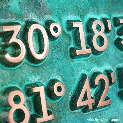 -. Title : Latitude Longitude Address Number Plaque 14x11 - Raised Copper Verdi Metal Coated