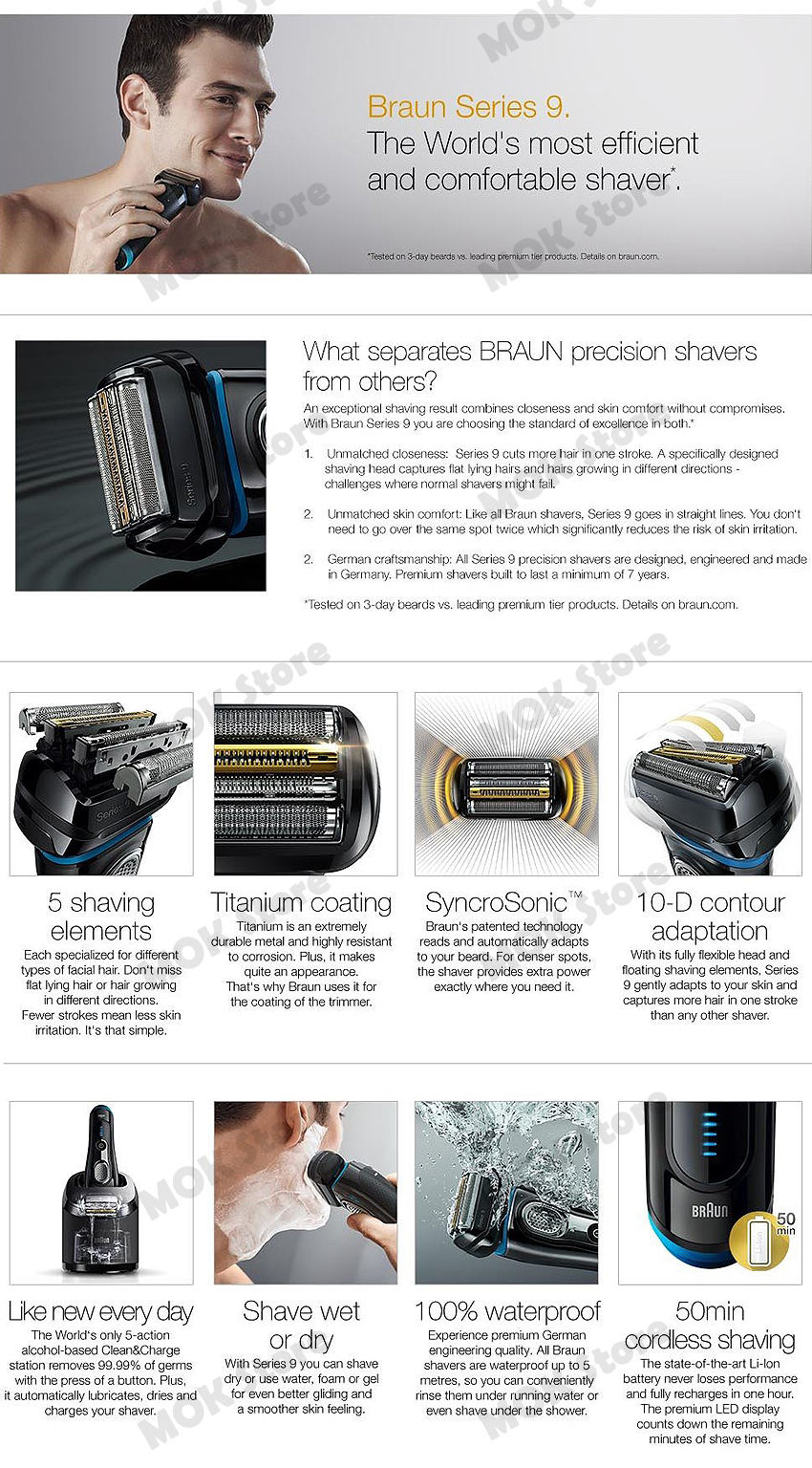 - Convenience features : Titanium coating/100% waterproof/Precision Trimmer/Multi Head Lock