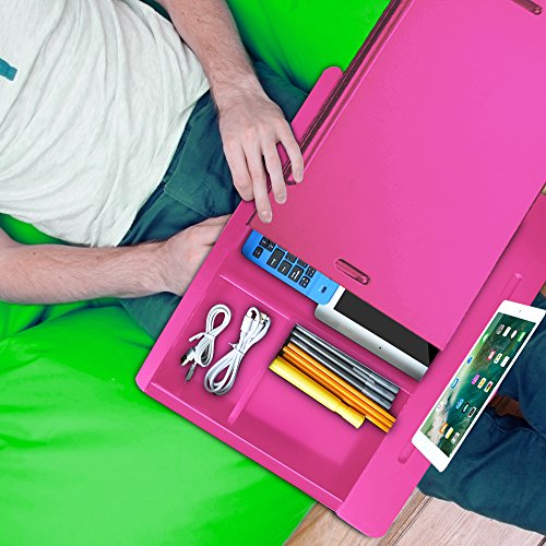-. Feature : IT'S A BRIEFCASE. IT'S A DESK. IT'S A WORKSTATION: With its storage compartments and handy carrying handle, this lap desk is ly suited for taking what you need for a day's work, anywhere you care to go / ERGONOMIC AND COMFORTABLE ANYTIME, ANYWHERE: The iCozy lapdesk lives up to its name: no matter where you go, the microbead cushion at the bottom offers cozy, ergonomic, customizable working comfort. You'll be so comfortable you'll need to set reminders to take breaks! / OFFICE? YES. HANDY LEISURE READING AID? YEP: With three built-in compartments for stashing your tablet, notebook (the paper kind) and small office supplies, not to mention a paperback novel and sunglasses, you're ready for work or a day by the pool. / AMPLE WORKTOP FOR ANY SIZE COMPUTER: Whether it's a tablet or a full-blown laptop with a 17 inch screen, this versatile lap desk will accommodate whichever portable computer type you want or need to use. Anywhere. / PRODUCT DIMENSIONS: 14" Height x 18" Width x 6" Length