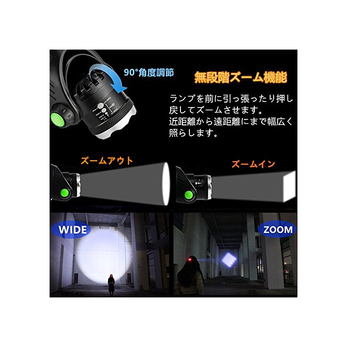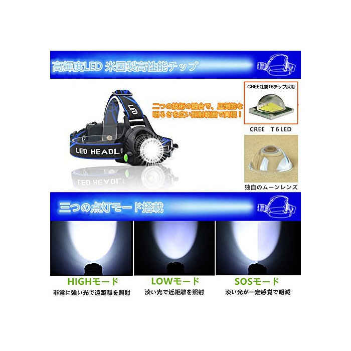 원본상품명: Aukelly ヘッドライト LED ヘッドランプusb充電式 アウトドアライト 高輝度CREE T6 IP65防水仕? 角度調節可能 ズ?ム機能 点?3モ?ド SOS機能18650電池付? 作業 自