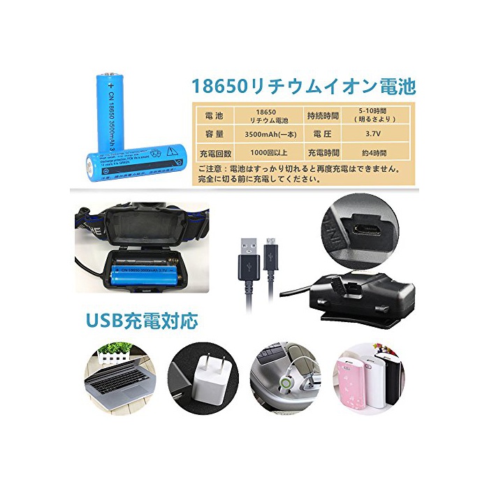 【전지 용량 증대&USB충전】3500mAh대 용량 리튬 이온 배터리2개 부착,점등 모드 로 인해1회 풀 충전해 약4-10시간 가동 가능하고,점등 시간도 보통 쪽이 길게 되고, 충방전 반복해가「1000회 이상」!LED헤드라이트는 Android USB충전 포토 디 자인에 여러가지 충전 방식이 있지만,모바일 배터리에서도 충전 가능합니다.리튬 배터리 사용 를 위해,스쳐 충전,스쳐 방전 보호 기능을 붙어 있기 때문에,편리하고 안심입니다.(전지와 충전기 부착)