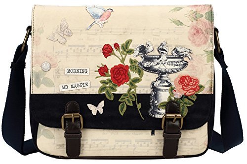 -. Brand : Vendula London -. Color : Cream -. Department : womens -. EAN : 5055333197007 -. Feature : Faux fastening buckles - the bag is actually closing with magnetic studs and a zip under the flap for more security / Canvas matching adjustable strap (1m50) / 1 outside zipped pocket at the back; 3 inside pockets; Bottom in faux leather + stud feet / Can fit a small laptop or an ipad / Washable PU coated fabric -. Model : 10437272 -. MPN : 10437272 -. PackageQuantity : 1 -. PartNumber : 10437272 -. ProductGroup : Apparel -. ProductTypeName : LAGE -. Size : Medium -. Title : Vendula London Women Designer Handbags Ladies Faux Leather Crossbody Songbird Messenger Bag