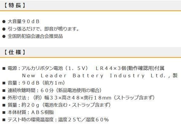 fk094igrjs紐を引っ張るだけの簡単操作で大音量の即音が鳴ります サイズ 個装サイズ:7.4×16×2cm 重量 個装重量:25g 生産国 中国 引っ張るだけで、即音が鳴る防犯ブザー 紐を引っ張るだけの簡単操作で大音量の即音が鳴ります