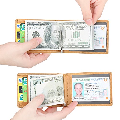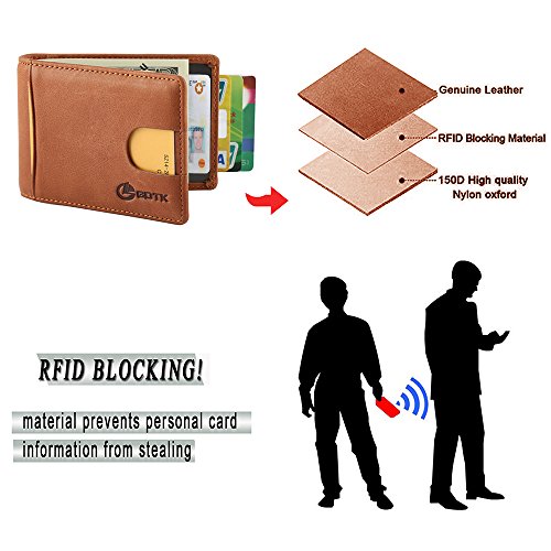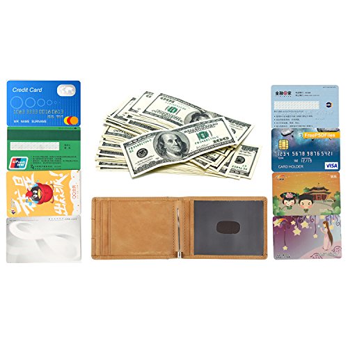 -. Feature : SAFETY & P.R.IVACY - Equipped with advanced unique military grade proP.R.Ietary blocking material, engineered specifically to block 13.56 MHz or higher RFID signals and protect the valuable information stored on RFID chips from unauthorized scans. / SLIM & STYLISH -Designed Quick Access ID Windows, Holds up to 6 to 10 cards plus US bills with no bulk, and a minimul Pull-tab design to reduce bulk / GENUINE LEATHER - Made with the Finest Grade Soft, Smooth Genuine leather,looks classy and very slim, Wallet Size: 4" in. x 3" in. .4" in. / MULTI FUNCTION - A wallet that will meet your everyday needs, is equipped with a front pocket made for your most used card. 2 pockets on the inside, with a photo ID slot, and a money clip to hold your cash. Wallet case also has smart pull-strap for quick access to your everyday cards. / 100% MONEY BACK GUARANTEE - If you're not completely satisfied with our RFID Blocking Wallet, then we will refund your entire purchase.