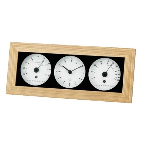 温度計・湿度計・時計の機能を備えています。材質は天然木を使用。