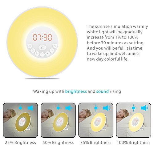 - Sunrise Simulation & Alarm Clock -- 30 minutes before wake up time,The wake up light brightness will be increased from 1% of the brightness to 100% gradually,.At alarm time ,The nature sound or Radio will be played for 2 minutes.Bring you to a Colorful New life.