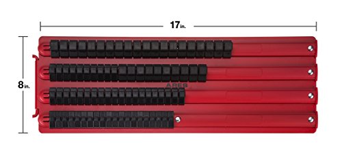 ITEM SPECIFICATIONS: Each rail holds 20 sockets. The clips have spring loaded ball bearings to firmly hold sockets in place, even upside down. Each holder is 17” long.