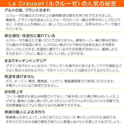 멋진 컬러와디자인나와 알려진다【Le Creuset(르쿠르제)】하나 하나가 사람의 손에,정성을 만들어져 있는 것으로도 유명인 그 제품은,전세계의 키친으로 사용되어 있습니다. 《무라》가 없는 열주위와 우수한 보온성에,화력이 센불 에서의 조리는 필요 없습니다.르쿠르제의 냄비는 코트 코트 조리하는 푹 삶아 요리뿐만 아니라,밥을 짓거나 튀김도 맛있게 마무리합니다.신맛으로도 강하게 냄새가 얼룩부 어려운이 나와 잼 만들기 등에도 대활약입니다.르쿠르제의 냄비는 단지 조리 기구 가(이) 아닙니다.디자인성이나 멋진 컬러에 키친을 화려함으로 칠합니다.