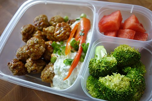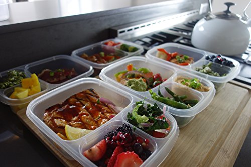 REUSABLE, 3-COMPARTMENT SEPARATION: Simplify Meal Time and Keep Vegetables, Fruits, and Proteins Separate. Food Stays Fresher Longer and Easily Stacks in the Refrigerator. Pack in a Gym Bag, Take Your Food To Go. Dishwasher Safe. Measurements = 24 oz, 6 oz, 4 oz. (2 3/4 cup, 3/4 cup, 1/2 cup)