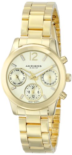 Studio : Akribos XXIV Publisher : Akribos XXIV Binding : Watch Product Description Add some style to any ensemble with this elegant bracelet watch from the artisans of Akribos XXIV. The sub dials feature the day, date, and GMT (24 hour) indicator. Its classic bracelet and luminescent hands and markers result in a clean style that fits casual and modern outfits. 0
