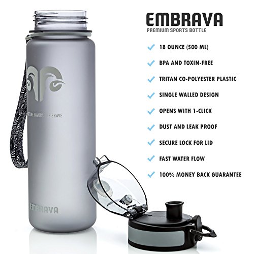 -. Feature : ➤ #1 WATER BOTTLE FOR SPORTS AND OUTDOORS - Embrava Premium Sports Bottle is specially designed with you, the active user in mind. Open the bottle with just one-click, slide your hand into the side strap and start drinking! Customers love it with an average rating of 4.8 OUT OF 5 STARS! The Embrava bottle is perfect for Running, Gym, Yoga, Crossfit, Tennis, MMA, Travel, Hiking or Office Use! / ➤ NON-TOXIC AND ECO-FRIENDLY PLASTIC - Our bottles are made from 100% Toxin Free US imported Tritan Co-polyester plastic that is SAFE to your body and environmentally friendly. No more worrying about harmful chemicals such as BPA affecting your health, which are present in many water bottles. If you are looking for a bottle that is durable and safe, Embrava is the right choice! / ➤ PREMIUM QUALITY SINGLE WALL DESIGN - Unlike dull, off the shelf water bottles, we designed the Embrava bottle to look and function better than any other water bottle! It is ergonomically shaped to make one-handed use a breeze, with a tough carry-strap and a special reflective frosted casing that reacts uniquely to your environment. It is both stylish and convenient to use, and each bottle comes in a FREE Gift Box for a great present! / ➤ 18 OZ SMALL, DURABLE AND LIGHTWEIGHT - This is where our premium design shines! Embrava 18 ounce, 500 ml bottles are tough, durable and resistant to impact. The special spill-proof top swings open with a one-handed push of a button! An air hole placed on the lid ensures fast flow of water with effortless drinking. And when you're done with our workout, lock the bottle to make it 100% leak-proof and dirt-proof. / ➤ 100% FREE BONUS GIFT & GUARANTEE - Order the Embrava bottle now and receive our "HYDRATION FOR ATHLETES" guide for free. This 10 pages long PDF guide will help you learn the optimal levels of hydration necessary for reaching peak performance! Just click "Add to Cart" on this page to get your EMBRAVA water bottle and free gift today. Your purchase will be backed by a 100% money-back guarantee.