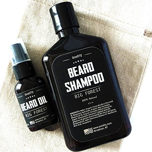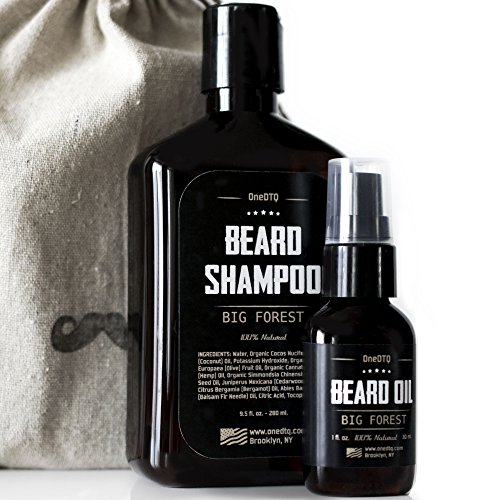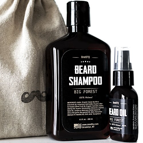 Big Forest Beard Growth Kit: Beard Wash & Beard Oil - 100% Natural & Organic Facial Hair Care Set for Men - In a Mustache Stamped Linen Pouch