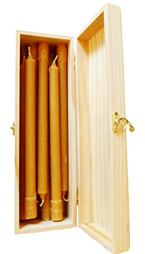 This colonial beeswax taper candles measures 11 inches and has a bell shaped top and self-fitting base. Wood Box 13.5x4x3.8 inch