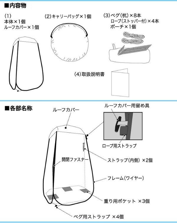 | 素材・材質 | 本体・ルーフカバー・ロープ:ポリエステル 内部ワイヤー・ペグ:スチール |