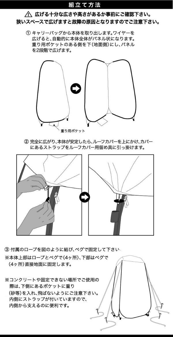 組立・収納が簡単な小型テント♪天井カバー付きでプライバシー保護も万全ですので、キャンプやアウトドア、災害時等の更衣室にピッタリです。市販のポータブルトイレ等と組み合わせて使えば、簡易トイレになります。用を足している時に風で飛ばされないように支えるストラップ付き♪ |