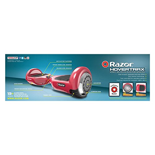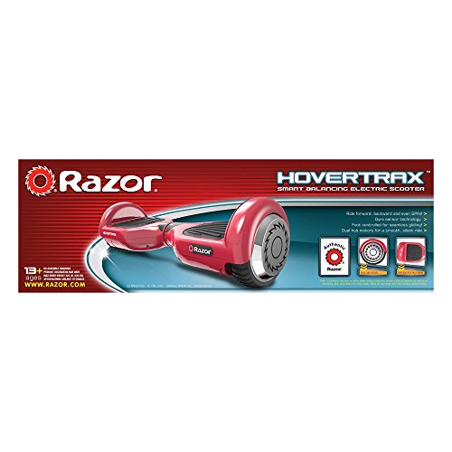 Step onto the all-new Razor Hovertrax and step into the future of riding with this innovative smart balancing electric scooter. Its gyro-sensor technology stays in perfect sync with you, allowing you to glide seamlessly in any direction with a simple shift of your foot, while its dual hub motors provide smooth, silent power for up to 115 minutes of futuristic fun. With speeds up to 6 miles per hour you will have a blast zipping around on this wheeled smart hover board. Kids ages 13+ and kids at heart (at a weight of no more than 220 pounds) will enjoy the thrill of the Razor Hovertrax 1.0 Electric Hover Smart Board.Feature