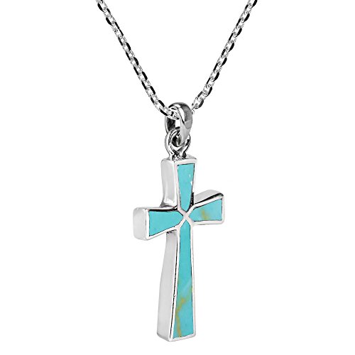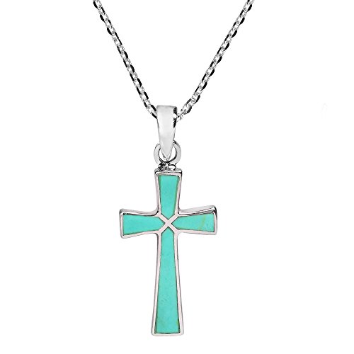 -. Feature : Material: Sterling Silver | Trademark: Stamped 925 / Stone: Simulated Turquoise | Color: Cyan Blue-Green | Finish: Shiny, Polished | Style: Religious, Symbol, Christian Cross / Pendant Measurements: 13 mm (0.51 in) wide x 31 mm (1.22 in) long (including bail) | Necklace Length: 18 in long x 0.75 mm thick / Bail Opening Measurement: 2 mm | Weight: 3.53 grams | Chain Type: Cable | Clasp Type: Round SP.R.Ing Ring / Includes an original AERAVIDA jewelry gift box. Perfect for gift giving to someone special or keep for yourself!