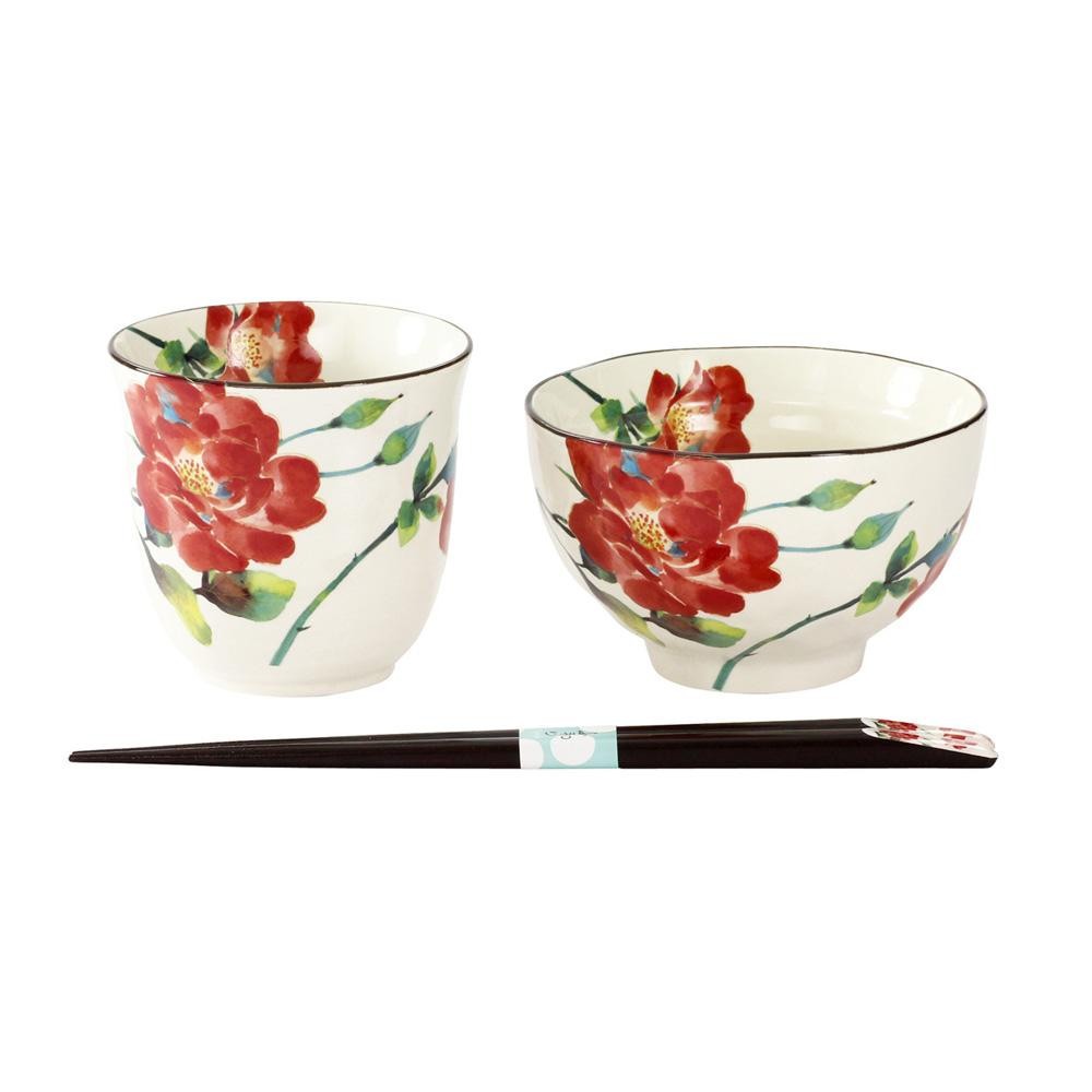 赤いバラを鮮やかに描いた飯碗・湯呑・天宝箸のセット。大切な方へのギフトにも最適です。