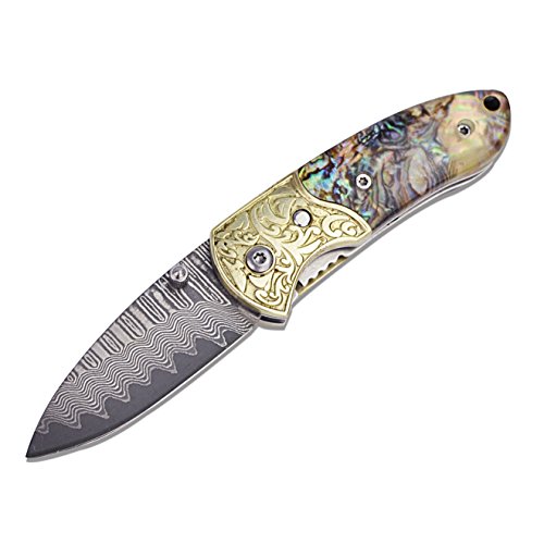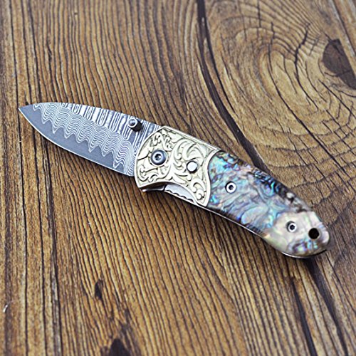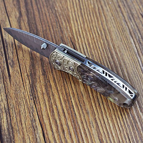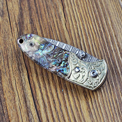 KUBEY Handmade Damascus Steel Mini Pocket Knife,Wooden/Abalone handle,3-Inch Closed