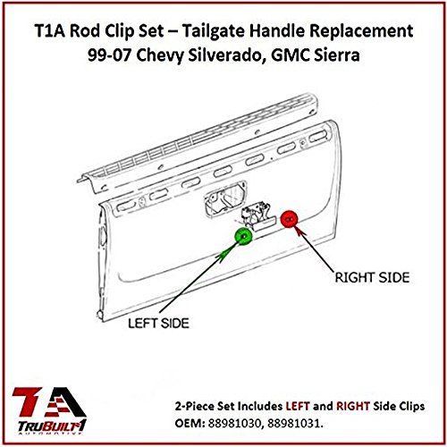 DIRECT REPLACEMENT - The T1A tailgate/door handle rod clip set replaces genuine Chevy/GM part numbers: Green: 88981030, Red: 88981031. Fits 1999-2006 Chevrolet Silverado, 2007 Chevrolet Silverado Classic, 1999-2006 GMC Sierra, 2007 GMC Sierra Classic.